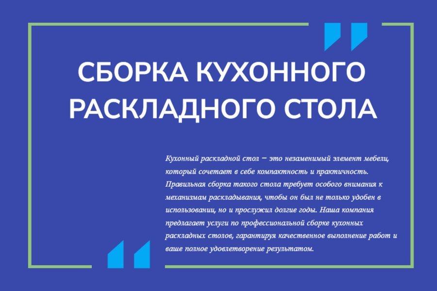 Кухонный раскладной стол – это незаменимый элемент мебели, который сочетает в себе компактность и практичность. Правильная сборка такого стола требует особого внимания к механизмам раскладывания, чтобы он был не только удобен в использовании, но и прослужил долгие годы. Наша компания предлагает услуги по профессиональной сборке кухонных раскладных столов, гарантируя качественное выполнение работ и ваше полное удовлетворение результатом.